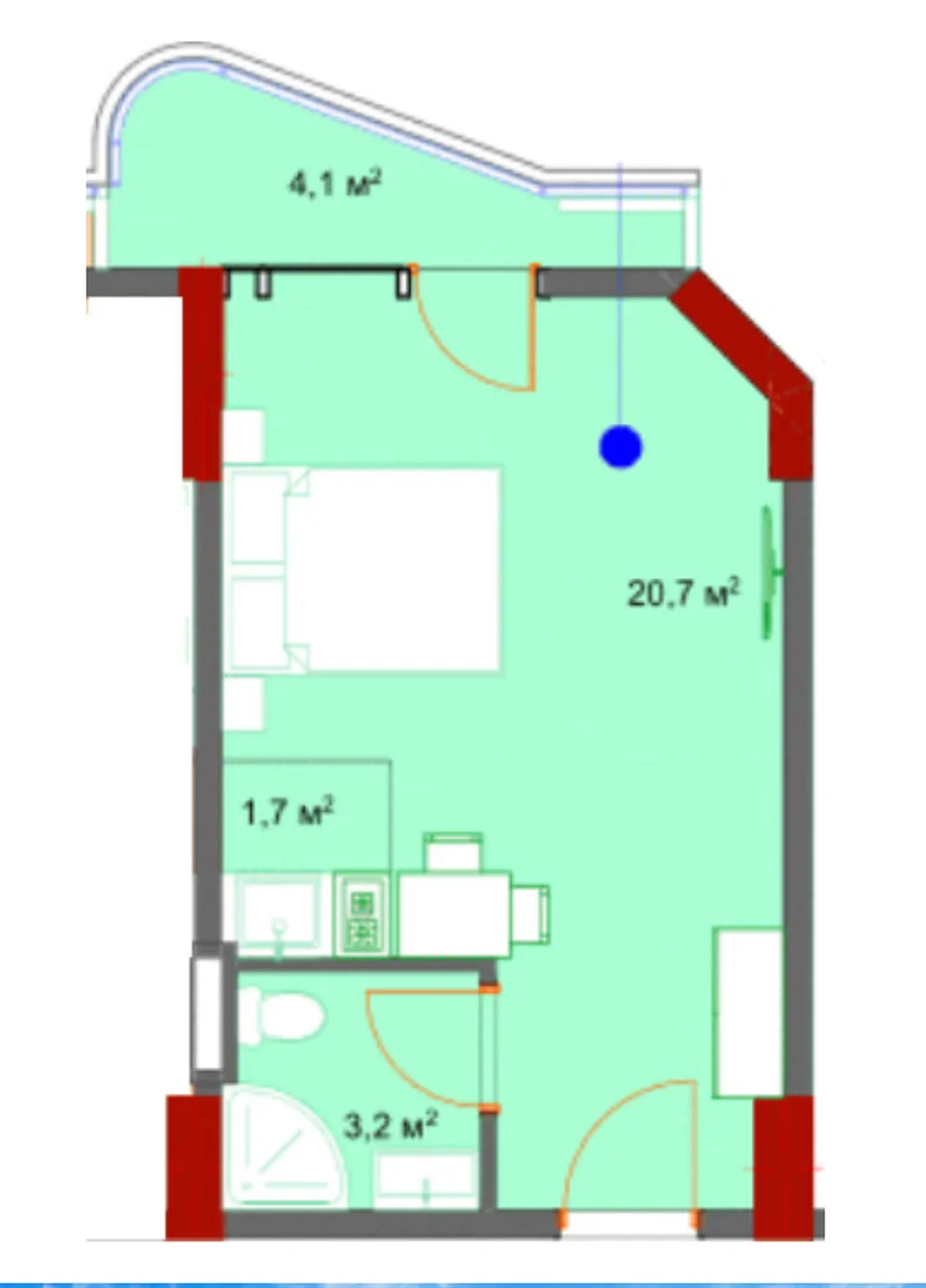 Lo spazio del monolocale è progettato nel modo più funzionale possibile: un'unica stanza è facilmente divisibile in zone per dormire e riposare, mentre le finestre offrono una vista pittoresca sul mare e su Batumi. L'appartamento è dotato del sistema "Smart House" e il balcone arrotondato aggiunge spazio utile e serve come luogo ideale per il caffè mattutino. Il complesso è un edificio monolitico di 21 piani con una resistenza sismica fino a 9 punti, dove sono presenti ascensori separati per passeggeri e merci.