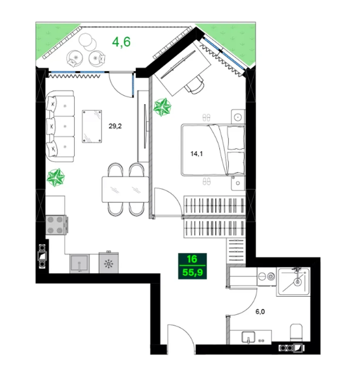 Ключевое преимущество — изолированная спальня (14.1 м²), что обеспечивает полноценный приватный отдых. Просторная гостиная-столовая 29.2 м² становится светлым многофункциональным пространством. Дополняют картину балкон 4.6 м² и увеличенный совмещенный санузел (6.0 м²). ✅ Преимущества: чёткое зонирование, отсутствие ощущения тесноты, собственная открытая лоджия.