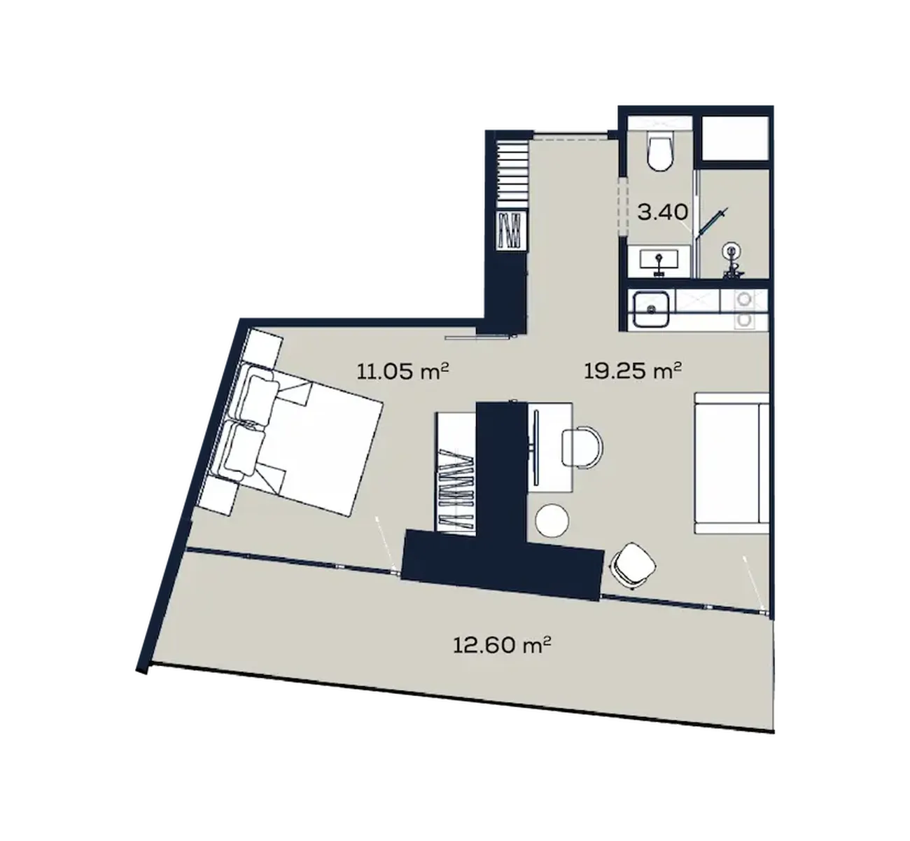 Квартира включает изолированную спальню (11,05 м²), гостиную (19,25 м²) и отдельный санузел (3,4 м²). Главное достоинство — просторный балкон (12,6 м²), который по площади сравним с комнатой и может выполнять роль летней гостиной, столовой или места для работы. Панорамное остекление и продуманная планировка создают ощущение лёгкости и функциональности.