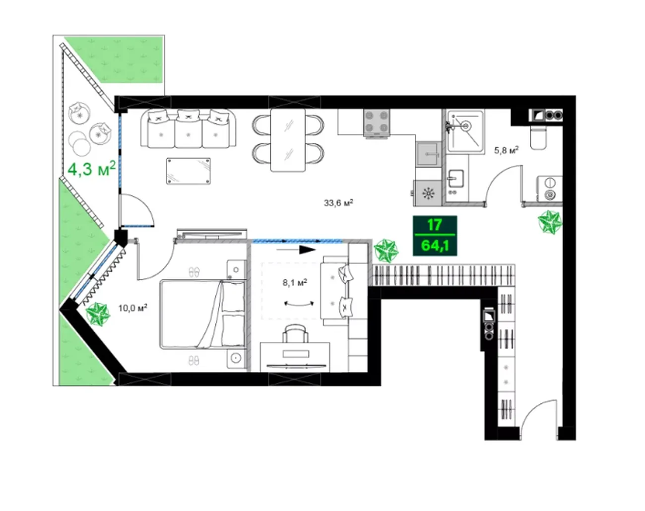 Практичная планировка включает две изолированные спальни (10.0 м² и 8.1 м²) и неожиданно просторную гостиную-столовую 33.6 м². Санузел совмещенный. Квартиру дополняет балкон 4.3 м². ✅ Преимущества: приватность спален, большая светлая гостиная для отдыха и приема гостей, эффективное использование площади.