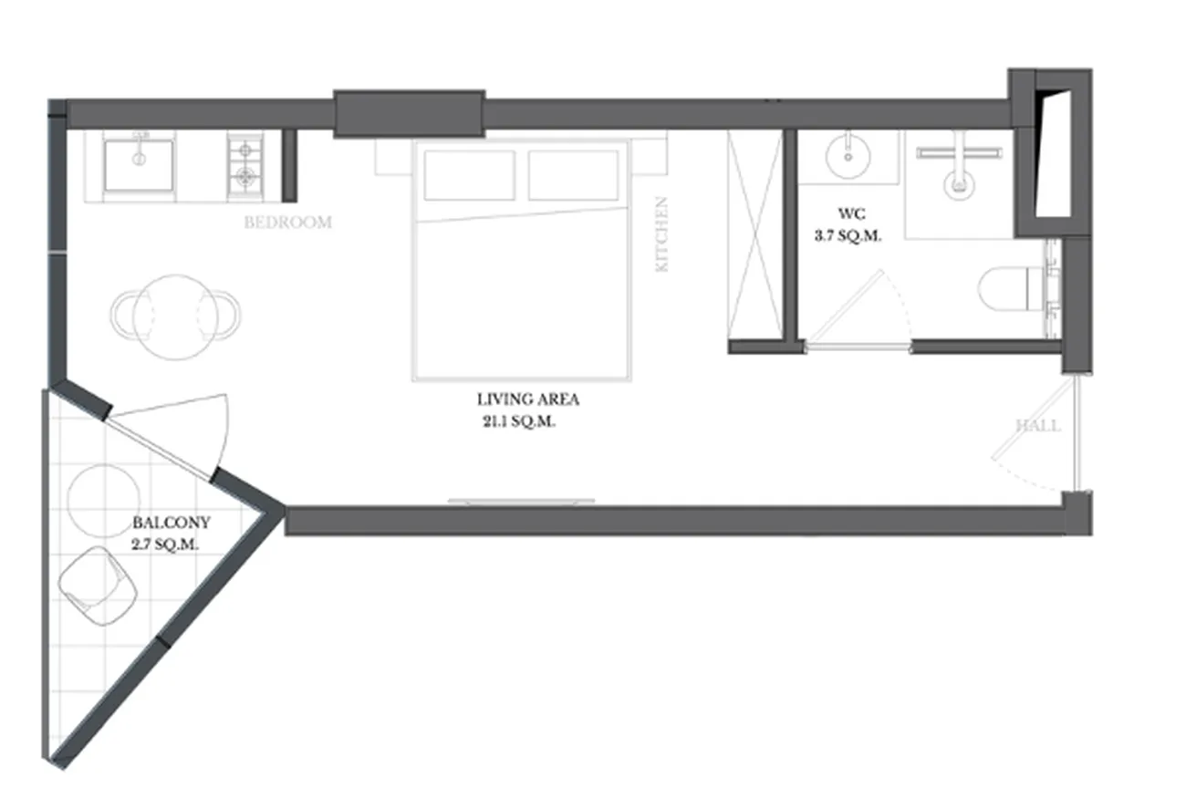 Умное пространство open-plan объединяет гостиную и кухонную зону (21.1 м²). Санузел совмещенный. Несмотря на компактность, квартира содержит всё необходимое для комфортного проживания, а балкон добавляет приятный бонус в виде личного открытого пространства. ✅ Преимущества: максимально эффективная площадь, современная планировка, готовность к быстрому заселению.