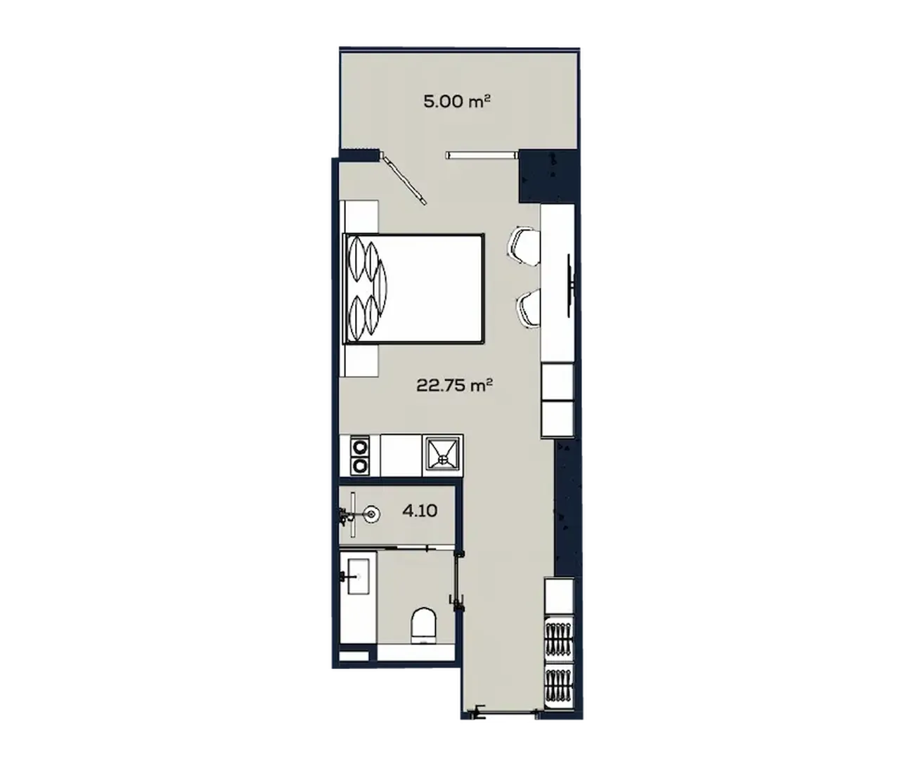 Просторная жилая зона 22,75 м² объединяет гостиную, спальню и кухню, создавая светлое и воздушное пространство. Отдельный балкон (5,00 м²) добавляет квартире дополнительный метр для утреннего кофе или вечернего отдыха. Аккуратный санузел (4,10 м²) готов к чистовой отделке. Главное преимущество — максимально эффективное использование площади без ощущения тесноты.