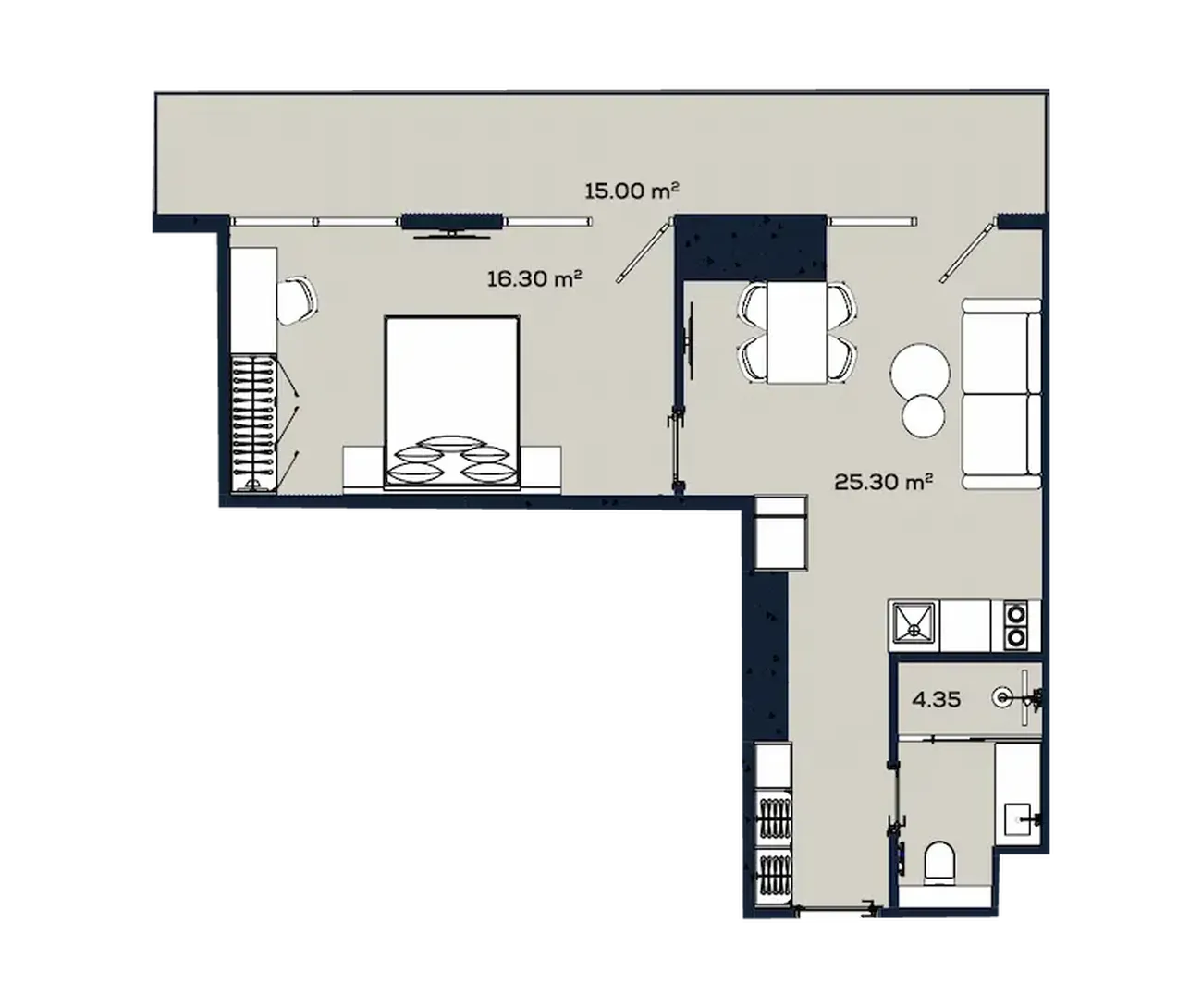 Практичная планировка создает ощущение простора: изолированная спальня (16,30 м²) и большая светлая гостиная (25,30 м²), совмещенная с кухней. Главная особенность — огромный балкон площадью 15,00 м², который фактически становится второй гостиной или столовой под открытым небом. Отдельный санузел (4,35 м²) завершает эту гармоничную и продуманную структуру, где каждому найдется свое пространство.