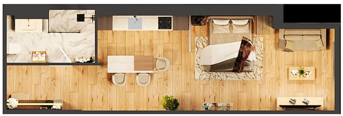 Продуманное открытое пространство объединяет зоны отдыха, кухни и столовой — идеальный формат для одного человека или пары. Панорамные окна наполняют студию светом и открывают живописные виды на море, горы или город (уточняйте). В вашем распоряжении — балкон, современный санузел и ниши для хранения. Трёхметровые потолки добавляют воздушности, а качественная отделка «зелёный каркас» оставляет свободу для дизайнерских решений.