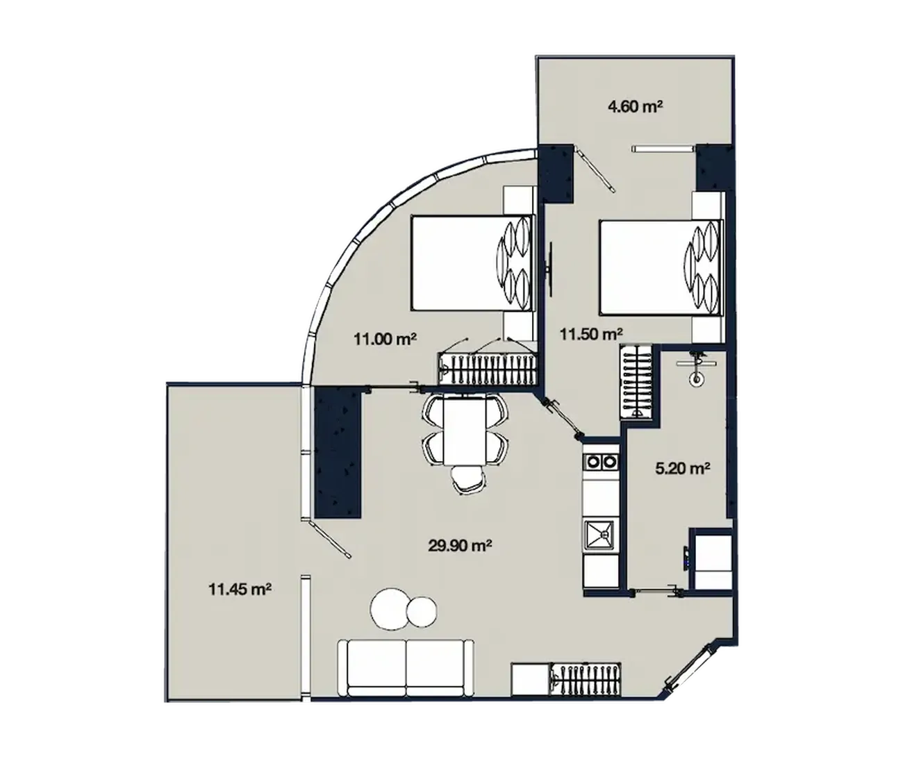 Квартира предлагает продуманную планировку: две изолированные спальни (11,00 м² и 11,50 м²) и большую светлую гостиную-столовую (29,90 м²), совмещенную с кухней. Уникальная особенность — два раздельных балкона (11,45 м² и 4,60 м²), которые можно использовать как зону отдыха и летнюю столовую. Современный санузел (5,20 м²) дополняет преимущества этой квартиры. Большие окна и правильное зонирование создают ощущение простора и уюта.