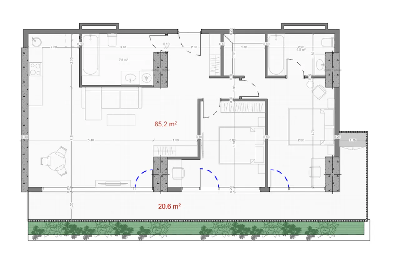 Двухкомнатная квартира • Общая площадь: 109.60 м² • Жилая площадь: 85.20 м² • Терраса: 24.40 м² • Жилой комплекс «Serenade» • Район Новый Бульвар, Батуми.