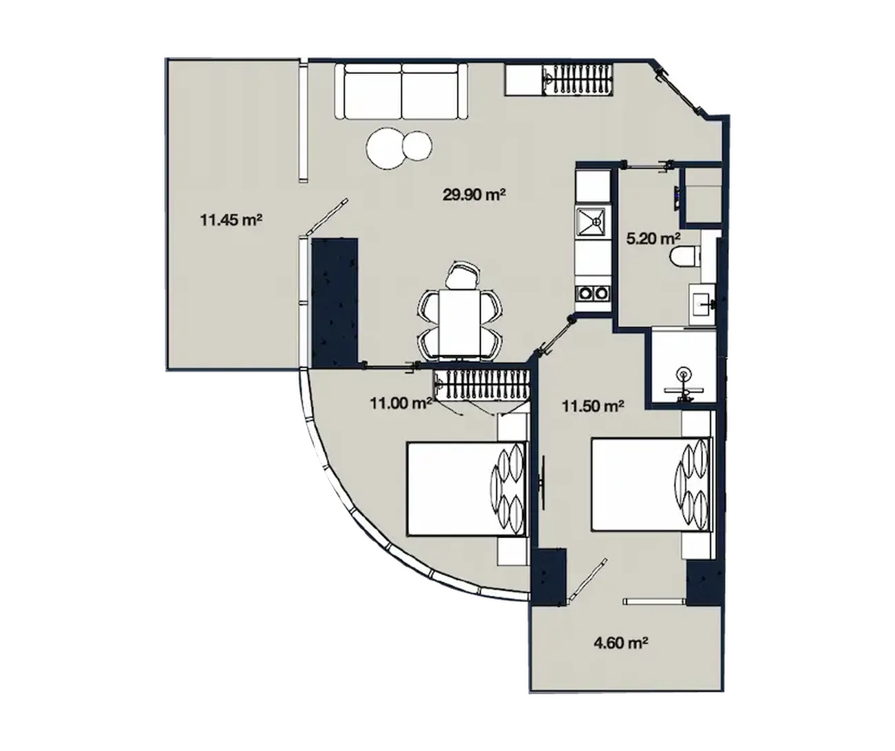 Квартира отличается продуманной планировкой: две изолированные спальни (11,00 м² и 11,50 м²) и большая светлая гостиная (29,90 м²), совмещенная с кухней. Особенность объекта — два балкона разного размера (11,45 м² и 4,60 м²), которые можно использовать как зону отдыха и летнюю столовую. Санузел (5,20 м²) готов к чистовой отделке. Большие окна и грамотное зонирование создают ощущение простора и уюта.
