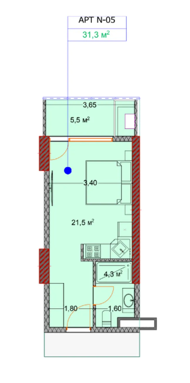 Это современная студия в строящемся жилом комплексе в одном из новых районов Батуми. Её общая площадь составляет около 31.3 м², включая просторный балкон 5,5 м².