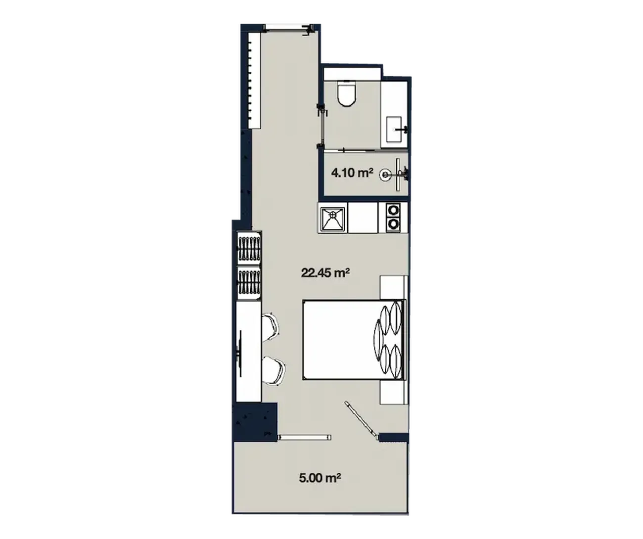 Просторная жилая зона (22,45 м²) с объединенной кухней создает светлое и свободное пространство для жизни. Отдельный балкон (5,00 м²) значительно расширяет полезную площадь и станет вашим любимым местом для отдыха. Современный санузел (4,10 м²) готов к чистовой отделке. Ключевое преимущество — максимально эффективное использование площади, что обеспечивает ощущение уюта и комфорта.