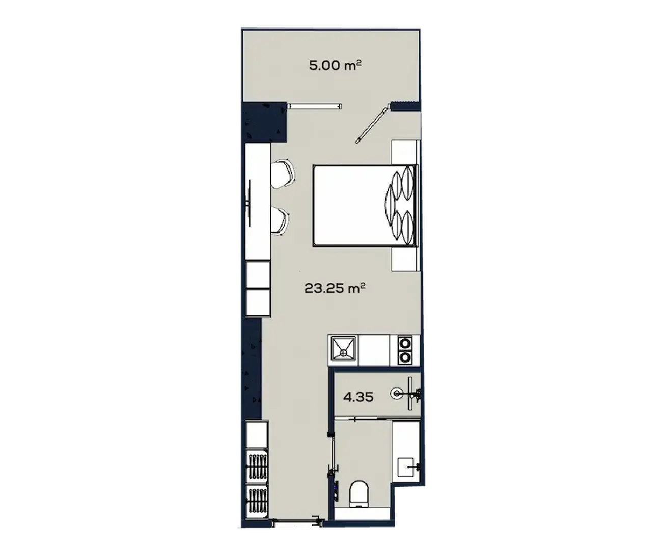 Большая жилая зона (23,25 м²) объединяет гостиную, спальню и кухню, создавая светлое и функциональное пространство для жизни. Отдельный балкон (5,00 м²) открывает возможности для обустройства зоны отдыха с потенциальным видом на морскую панораму. Аккуратный санузел (4,35 м²) ждёт чистовой отделки. Преимущество — гармоничное сочетание простора и уюта, а также возможность создать интерьер с нуля.