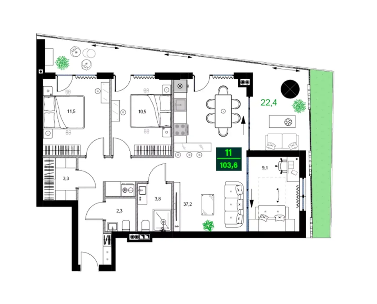 Вас ждут три изолированные комнаты (11.5 м², 10.5 м² и 9.1 м²) для максимальной приватности и гибкости планировки. Центром дома станет просторная гостиная-столовая 37.2 м². Повышенный комфорт обеспечивают два раздельных санузлаБалкон 22.4 м² — это готовая терраса для отдыха всей семьей. ✅ Ключевые преимущества: много пространства для каждого, панорамное остекление, две ванные комнаты и эксклюзивная outdoor-зона.