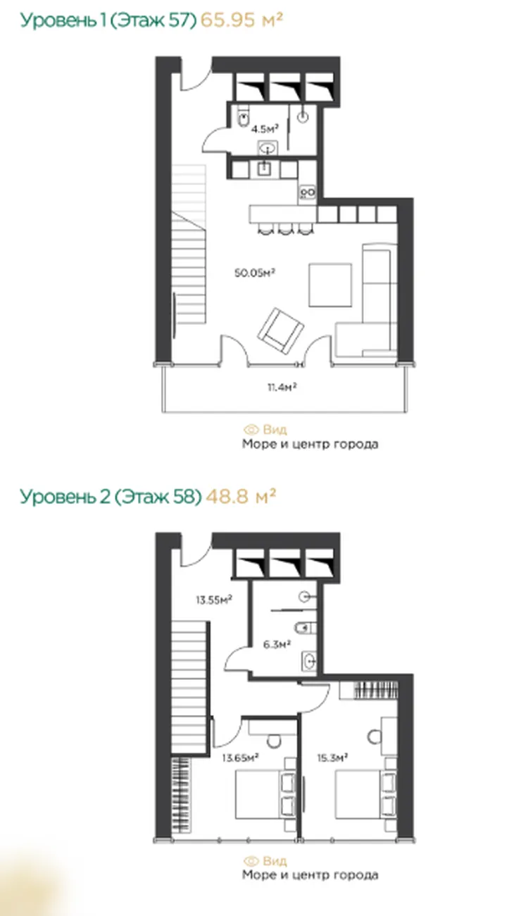 Просторный двухуровневый формат включает две изолированные спальни (13.65 м² и 15.30 м²), большую гостиную-студию площадью 50.05 м² и два раздельных санузла. На втором уровне организована галерея-коридор (13.55 м²). Панорамный балкон 11.40 м² предлагает захватывающий вид на море и центр города — вы будете наслаждаться курортной жизнью Батуми с высоты птичьего полета. Высота обеспечивает абсолютную приватность, невероятную панораму и ощущение эксклюзивности.