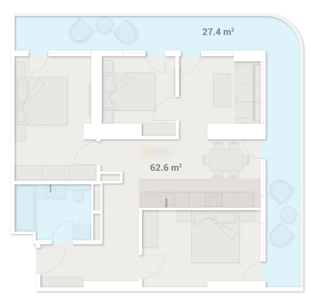 Квартира имеет классическую семейную планировку: три изолированные спальни, просторная гостиная, объединённая с кухней-столовой, и два санузла (один из них — раздельный). Большие панорамные окна наполняют все комнаты светом и открывают захватывающие виды на море, город и порт Батуми (вид зависит от этажа). Предусмотрена вместительная гардеробная комната и просторный балкон. Высокие потолки добавляют воздушности, а малое количество квартир на этаже гарантирует приватность и отсутствие очередей к лифтам.