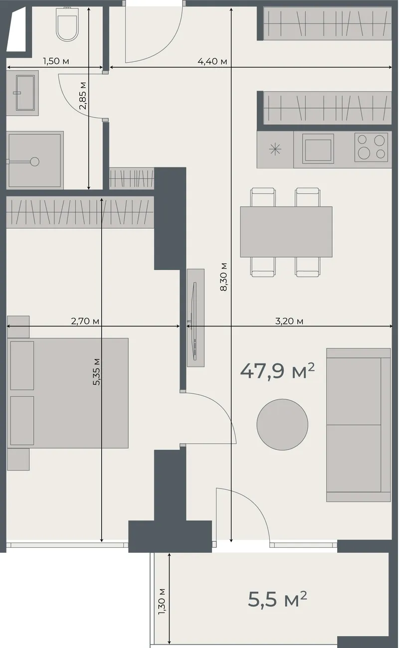• Kwadrat: Łącznie - 53,4 m² (salon: 47,9 m², balkon: 5,5 m²)
