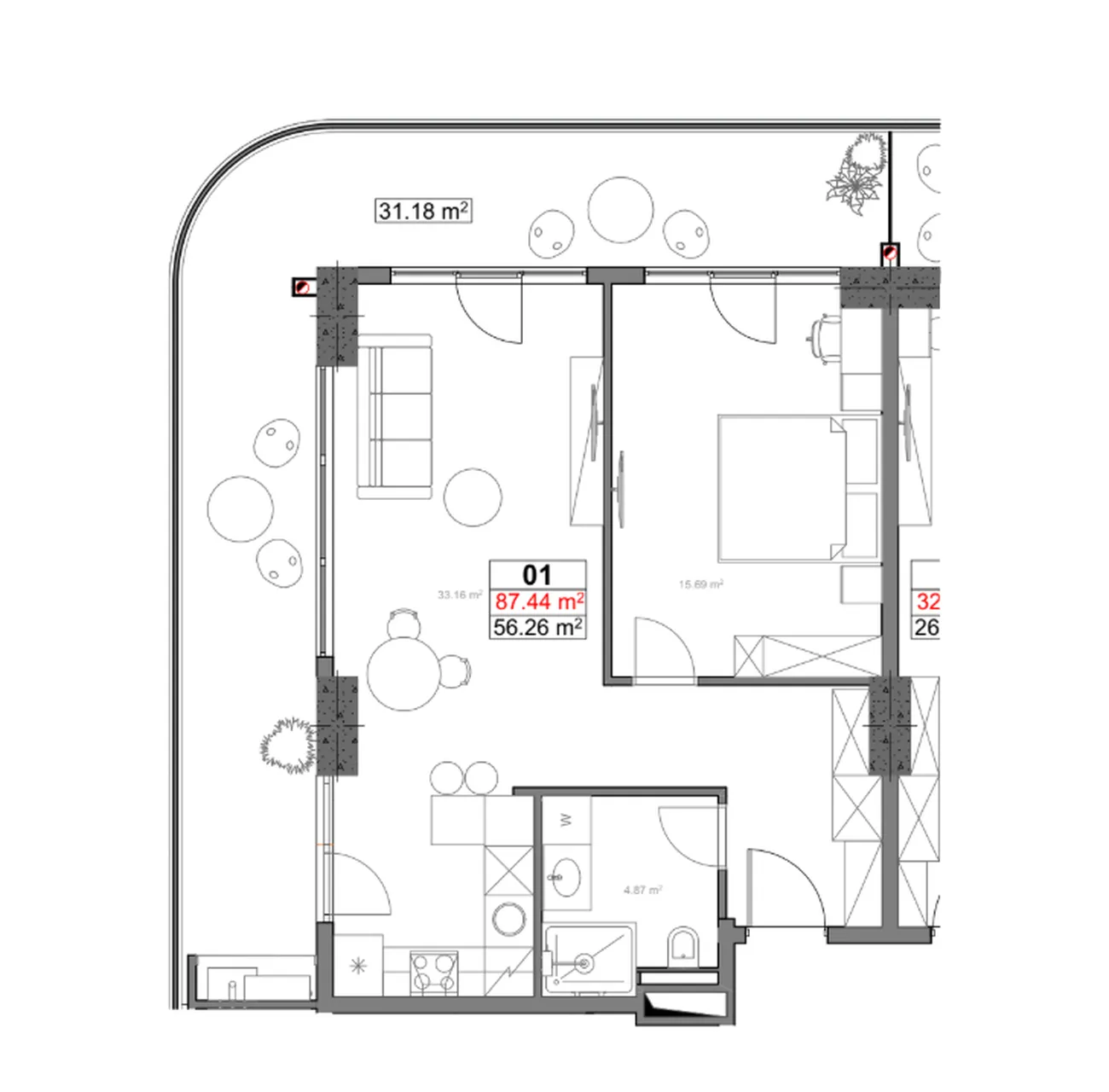 Mieszkanie charakteryzuje się niestandardowym układem: przestronną sypialnią (15,69 m²) i dużym salonem połączonym z kuchnią (33,16 m²). Główną atrakcją jest Taras o powierzchni 31,18 m²który staje się kompletnym salonem lub jadalnią na otwartym planie. Lokalizacja na 6 piętro w bloku A zapewnia doskonałe nasłonecznienie, widoki na bulwar i poczucie prywatności.