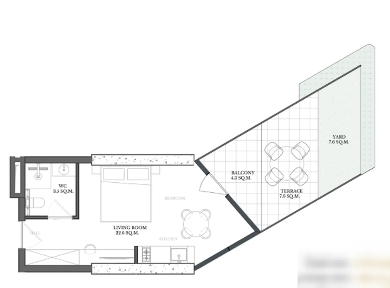 Przestrzeń jest zorganizowana zgodnie z zasadą otwartej przestrzeni: salon jest połączony z kuchnią (22.6 м²). Łazienka jest połączona. Kluczowa zaleta - własne patio strefa: tak balkon (4,3 m²) na poranną kawę, taras (7,6 m²) na lunch i całkowicie zamknięty dziedziniec (7,6 m²) dla maksymalnej prywatności. Korzyści: przemyślane połączenie z naturą, kilka funkcjonalnych obszarów zewnętrznych, poczucie osobistego domu.