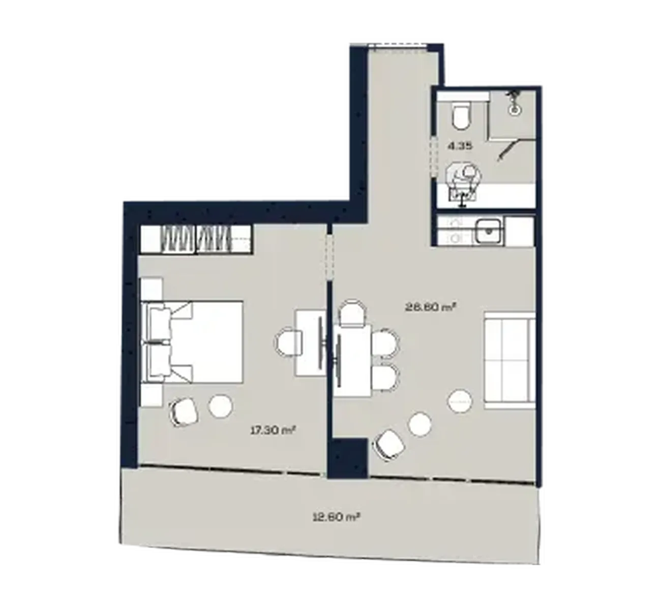 Daire şunları içerir izole yatak odası (17,30 m²), geniş oturma odası (28,60 m²) и ayrı banyo (3.90 m²). Bu özellik. geniş balkon (12,60 m²)Büyük pencereler iç mekanı ışıkla doldururken, uyumlu bölgelendirme özgürlük ve mahremiyet hissi yaratır. Büyük pencereler iç mekanı ışıkla doldururken, uyumlu bölgeleme özgürlük ve mahremiyet hissi yaratır.