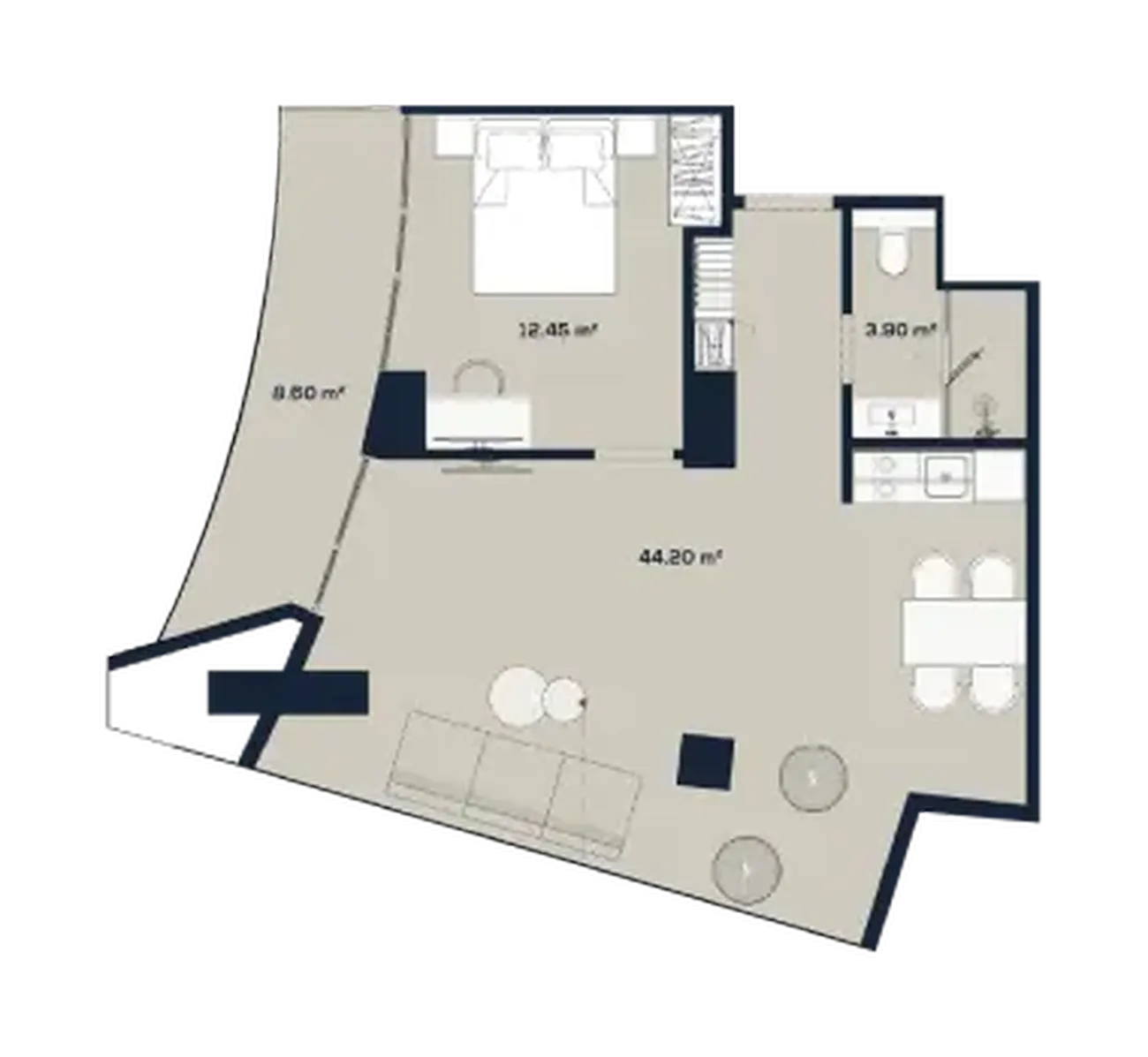 Daire şunları içerir izole yatak odası (12,45 m²), geniş stüdyo oturma odası (44,20 m²) и ayrı banyo (3.90 m²). Bu özellik. konforlu balkon (8.50 m²)Şehir manzarası eşliğinde dinlenme, kahvaltı veya akşam toplantıları için ideal bir yer haline gelir. Büyük pencereler iç mekanı ışıkla doldururken, uyumlu bölgeleme özgürlük ve mahremiyet hissi yaratır.