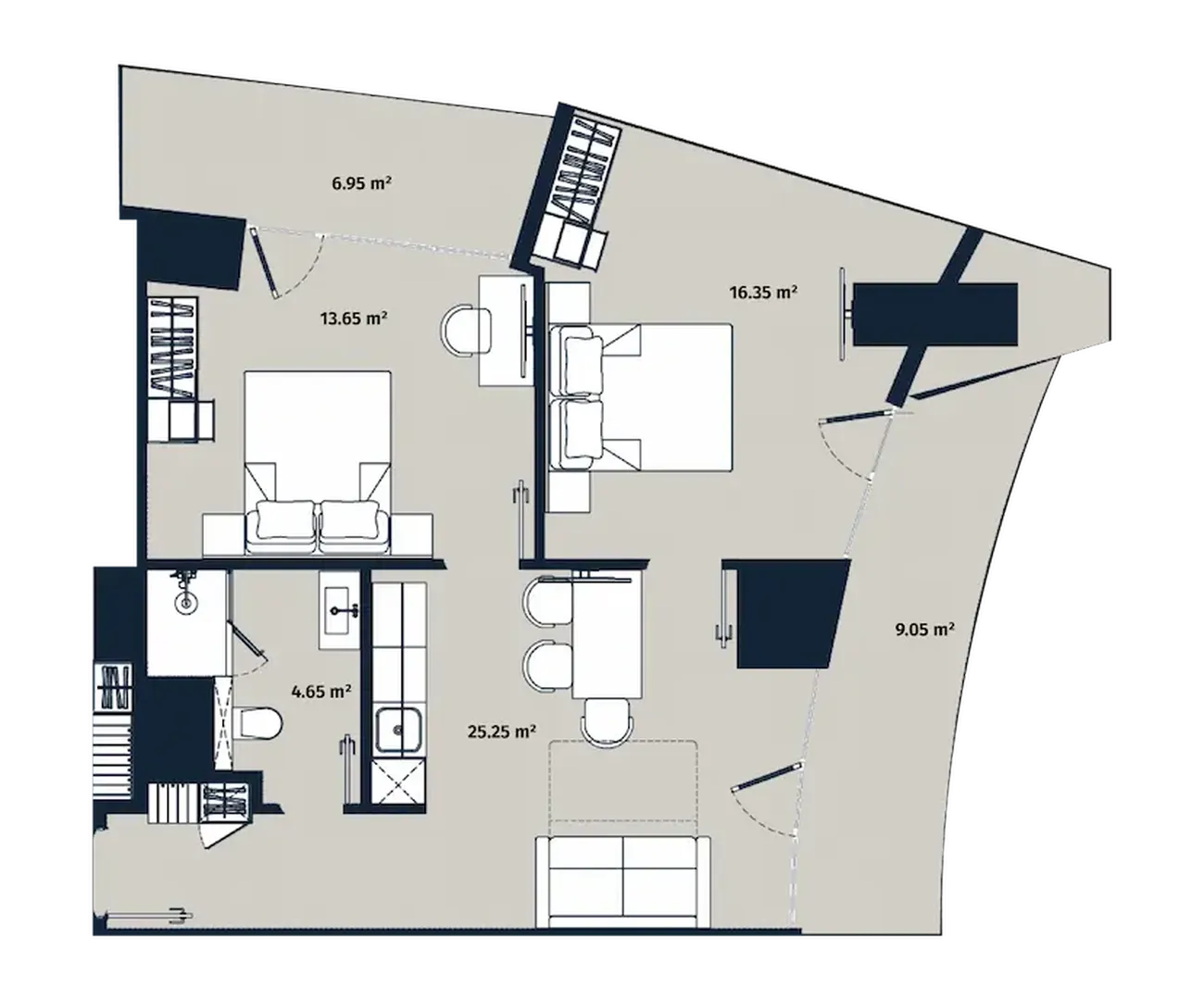 Daire şunları içerir izole yatak odaları (16,35 m² ve 13,65 m²), geniş oturma odası (25,25 m²) и ayrı banyo (4,65 m²). Bu özellik. iki balkon (6,95 m² ve 9,05 m²)Farklı amaçlar için kullanılabilir: kahvaltı alanı ve şehir manzarası eşliğinde akşam dinlenmek için bir yer. Büyük pencereler iç mekanı ışıkla doldurur ve net bölgeleme, mahremiyet ve sosyalleşmenin uyumlu bir kombinasyonunu sağlar.
