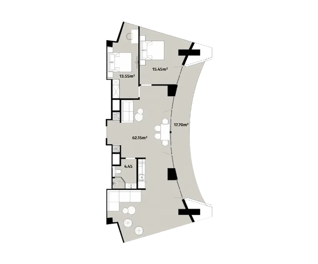 Dairede iki daire bulunmaktadır izole yatak odaları (13,55 m² ve 15,45 m²), geniş stüdyo oturma odası (62,15 m²) и ayrı banyo (4,45 m²). Bu özellik. büyük balkon (17,70 m²)Açık planlı oturma odası, şehir manzaralı tam teşekküllü bir salon, yemek alanı veya resepsiyon alanı haline gelir. Panoramik pencereler mekanı ışıkla doldurur ve açık plan oturma odası özgürlük ve ferahlık hissi yaratır.