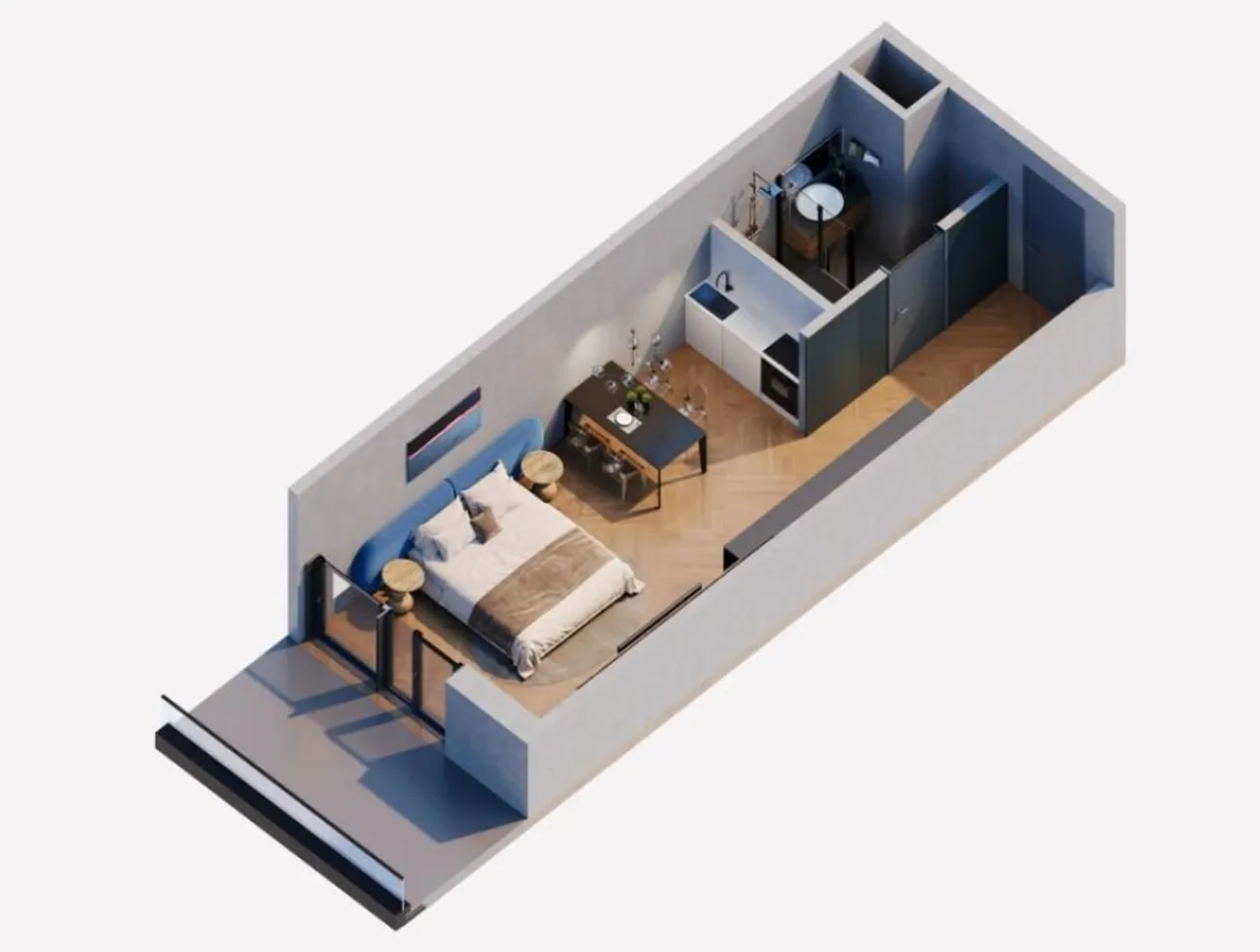 Студія виконана у фірмовому стилі Tonino Lamborghini: продуманий простір об'єднує спальну зону, міні-кухню і вітальню з панорамним склінням. З вікон відкривається вид на море, гори або міську панораму. У вашому розпорядженні - балкон (або тераса), санвузол преміум-класу, а також системи "Розумний дім" і високошвидкісні ліфти. Оздоблення "під ключ" позбавляє клопоту з ремонтом: досить завести меблі та насолоджуватися життям.