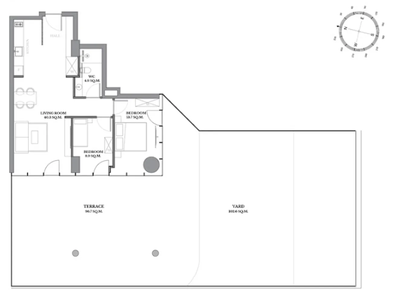 Простора світла вітальня (40,3 м²) з кухнею, дві ізольовані кімнати (8,9 м² та 13,7 м²) і сучасний санвузол (4,9 м²). Головне надбання об'єкта - безпрецедентні приватні відкриті простори: величезний балкон (96,7 м²) і власний сад (102,6 м²). Це надає рідкісну можливість створити справжню заміську резиденцію із зонами для відпочинку, розваг і ландшафтного дизайну, зберігаючи всі переваги квартири в сучасному комплексі.