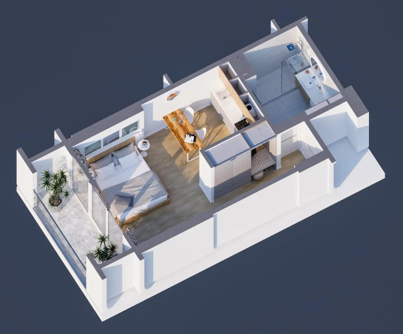 Квартира пропонує розумне вільне планування студії з чітким функціональним зонуванням на вітальню, кухонний блок і спальну зону. Головна цінність - повністю готовий дизайн-проект інтер'єру від професіоналів. До нього входять детальні креслення вбудованої кухні, шафи в передпокої, продуманої електрики і підсвічування, а також специфікація оздоблення преміальними матеріалами (керамограніт, вологостійкі покриття).